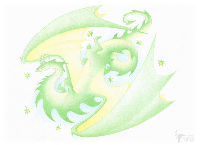 Самый молодой и самый беззаботный из четырех самых древних драконов-хранителей мира. Его часто можно застать летающим... задом наперед или вниз головой, за игрой с собственным хвостом или в прятки. Пожалуй, последнее-его любимейшая забава. Помнится, однажды он до дрожи в кончиках ушей напугал экспедицию эльфов-ботаников, которые отправились к старому лесному озеру на поиски редких водорослей, нигде более не встречающихся. Каково же было удивление одного из ученых, когда найденный им "образец" поднял над водой рогатую голову , улыбнулся от уха до уха и, похлопав глазками, сказал "Привет!". Для этого дракона прикинуться толстой лианой или огромной водорослью-не самая трудная задача, ведь весь он, от носа до кончика хвоста, покрыт зелено-золотой чешуей, а его гребень придает крылатому созданию сходство с каким-то огромным вьющимся растением. А еще у всех сородичей этого змея есть одна интересная особенность: если эти драконы задумали какую-нибудь шалость, то вы можете заметить, как в их глазах (не важно, какие они-голубые, золотые или красные) мелькают крошечные зеленые искорки восторга. Так что представьте теперь, на что способен дракон, который сам-сплошная зеленая искра!