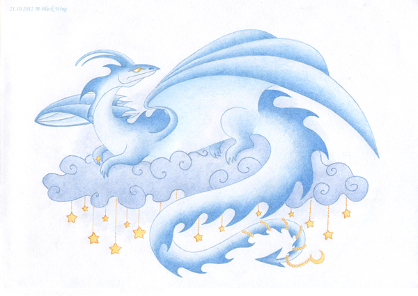 Любимое занятие дракона, которого вы видите на рисунке-следить за звездами. Он не только любуется ими, но также регулярно пересчитывает, следит за тем, чтобы те из них, которые собрались упасть, аккуратно и точно исполняли загаданные желания, а самые резвые, расшалившись, не падали в какие-нибудь черные дыры и другие странные и малоизученные уголки Вселенной, в которые редко кто заглядывает по собственному желанию.