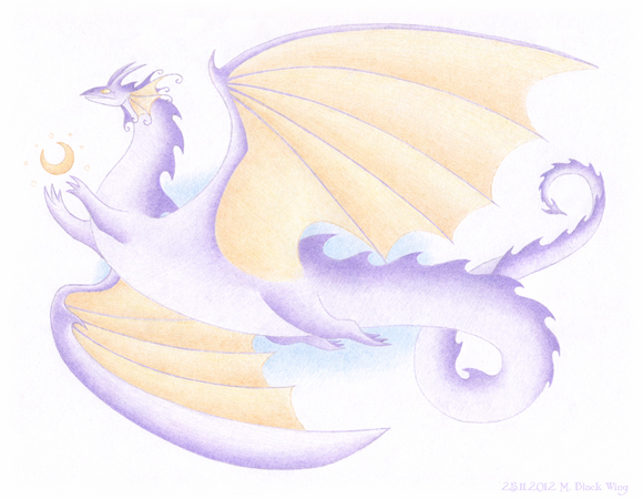 Иногда бывает так, что даже я не знаю, кто или что вылетит из-под кончика моего карандаша при случайном взмахе, когда мысли находятся где-то там, далеко от рисования, а пальцы играют с привычным предметом. Так получилось и с этим драконом, который, еще будучи простым наброском, назвал мне свое имя - Большое Фиолетовое Облако. Карандаш сам собой скользил по бумаге, складываясь в очертания чего-то большого, теплого и воздушного, а потом передо мной оказался он-тихий и задумчивый гигант, который любит парить среди облаков и играть с золотистой луной.