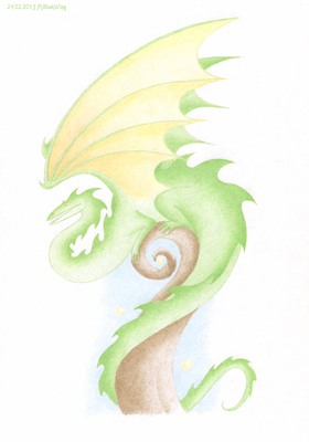 Этот дракон был начат в январе, но из-за того, что на меня свалилась неприятность, пролежал не дорисованным в ящике моего письменного стола больше месяца. На мои попытки порисовать во время болезни он отвечал недовольным шипением, ибо очень не хотел быть уничтоженным. К счастью, мне хватило благоразумия для того, чтобы спрятать змея подальше и не возвращаться к нему до подходящего момента. Такой момент наступил сейчас, в конце зимы, когда мое любимое время года потихоньку отступает и сворачивается белоснежным клубком, чтобы уснуть до декабря... Время пролетит незаметно, а сейчас на смену Зиме приходит Весна, а вместе с ней-вот такие зеленые, словно нежная молодая листва, драконы. Они несут под своими крыльями ласковый солнечный свет, такой мягкий и еще совсем не жгучий в эти дни. Один из них присел на корень могучего Древа, чтобы передохнуть и набраться сил перед дальней дорогой, ведь он и его собратья только-только отправились в путь.
